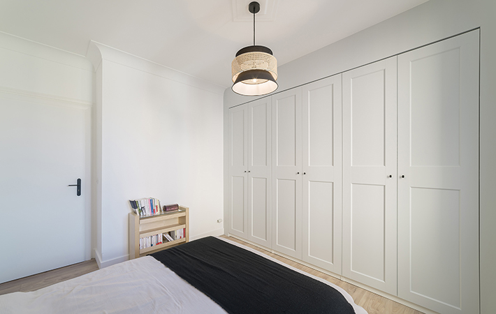 Pour profiter au maximum de l’aspect traversant de l’appartement, la cuisine et le séjour on été complètement ouverts afin de créer une grande pièce de vie emplie de lumière et mettre en valeur les moulures et le nouveau parquet en bâton rompu. Les chambres ont été complètement rafraîchies avec de nouveaux sols et des rangements intégrés et la salle de bain à été repensée pour avoir un espace le plus fonctionnel possible.